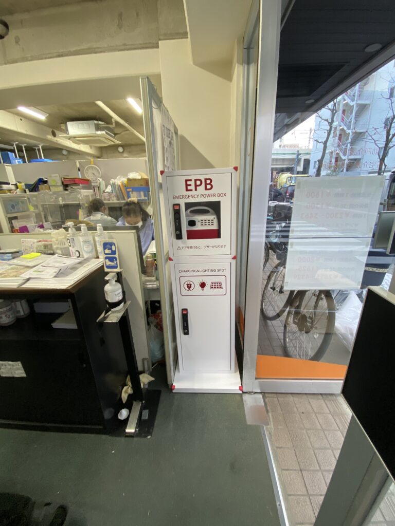 防災タワー「EPB」は、災害時の情報収集・連絡手段として欠かせないスマートフォンを約60台同時に充電可能なポータブル蓄電池をはじめ、太陽光パネル、LEDライトなどを搭載しています。電力復旧までの間に必要となる基本的なライフライン機能を、コンパクトに一体化した防災設備です。